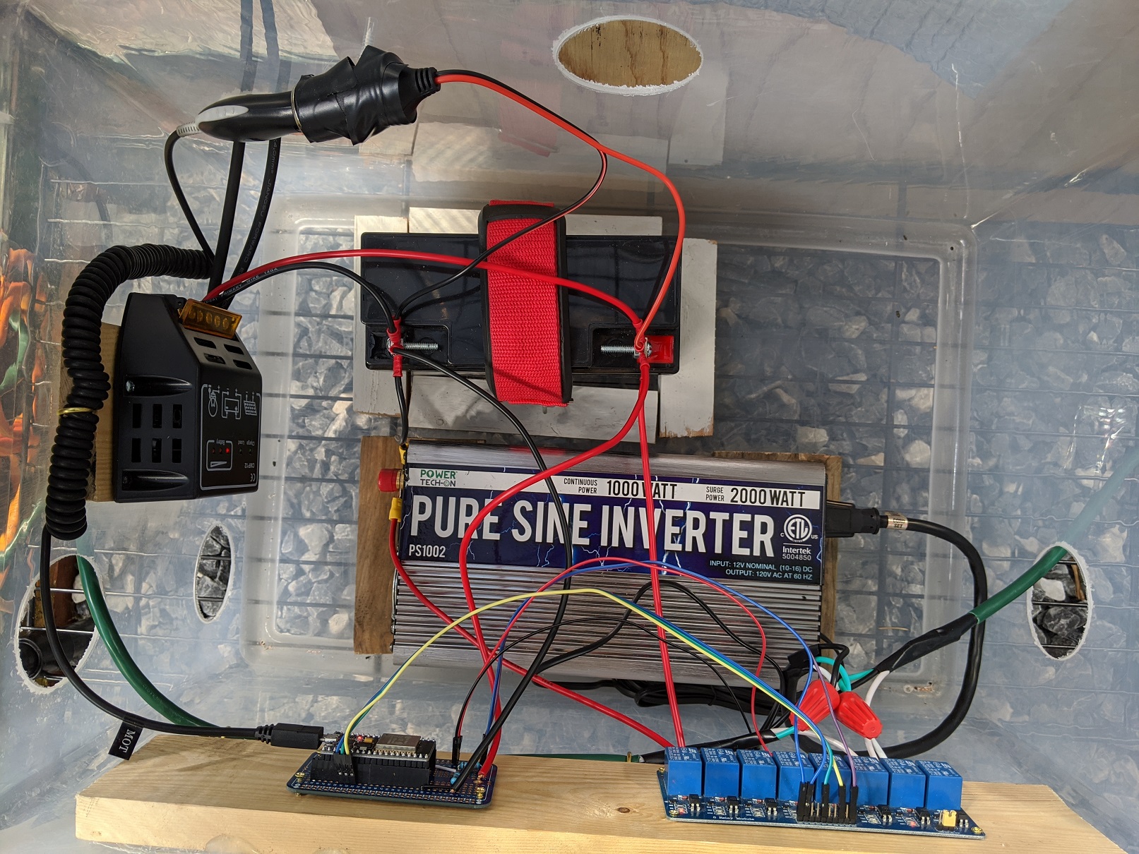 The power supply controller is more complicated than the environment monitor. It reads the voltage of a 12v solar system and decides whether the greenhouse should be powered by solar or the grid, then switches power supply accordingly. ESP32 is a 3.3v board, so a voltage divider is required to measure the solar voltage. A relay board closes some normally-open circuits when it's time to use solar power. This gives power to the inverter and switches the loads from grid to solar. However, after the circuit has been closed, I still need to press the power button on the inverter. To press the button automatically, I had to disassemble the wired remote that came with the inverter, and reverse-engineer the signal that the button sends, then send the same signal from the ESP32 instead. When it's time to go back on grid power, the inverter power button gets "pressed" again, and the relays are sent back to their normally-closed state. The solar system consists of a 100 watt panel, a charge controller, a 216 watt-hour rechargeable battery, and a 1-kilowatt pure sine wave inverter. Total cost for the power supply system was roughly $300, but half of that was the inverter, which has other applications.