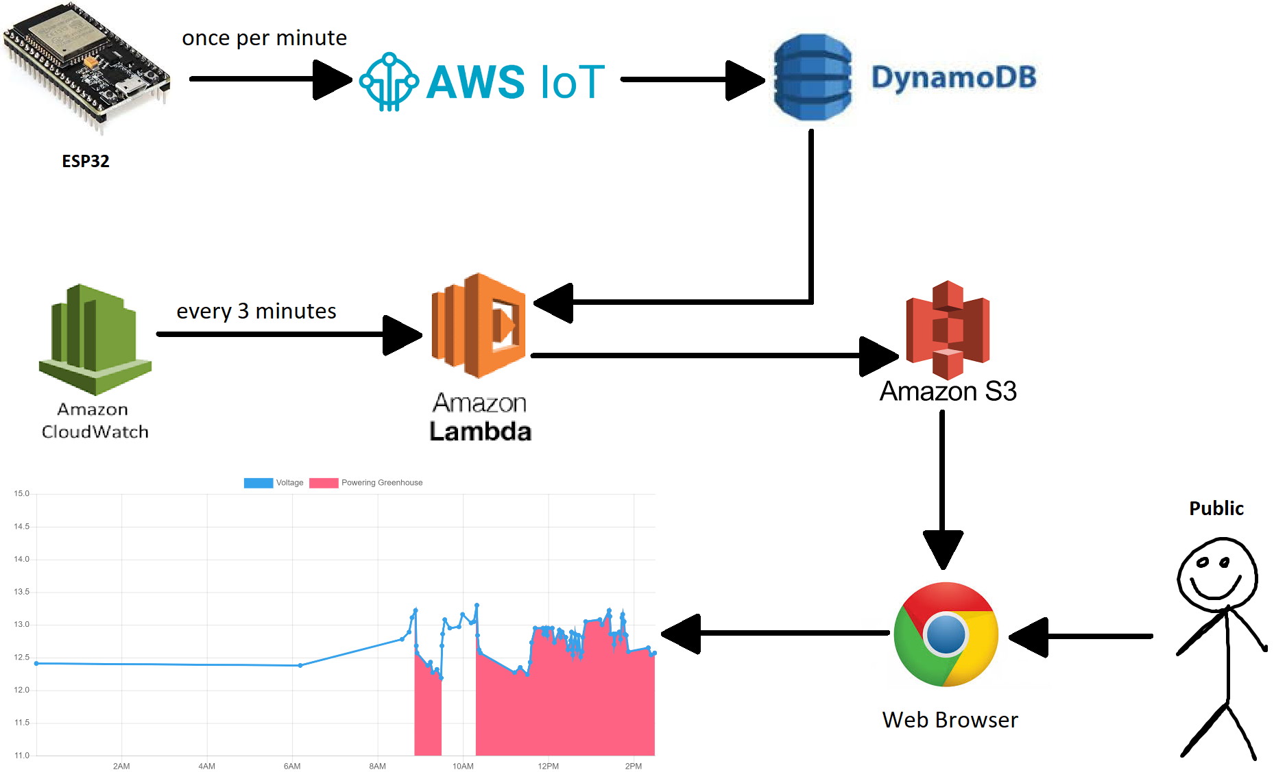 To make this site more interesting for the public, I decided to share the data from my personal account. Public access to DynamoDB and Lambda wouldn't scale well, however, so data is rotated asynchronously into S3. To do this, CloudWatch invokes a Lambda function every three minutes. This Lambda reads today's data from DynamoDB, and writes it to an S3 file. This public S3 file provides data to the dashboard page, which draws its graphs using chart.js. The website itself is an S3 static site with five html files. The whole application uses roughly a dozen AWS services, all running in the free tier. For all the Kanye fans out there that means my AWS bill is $Free.99!