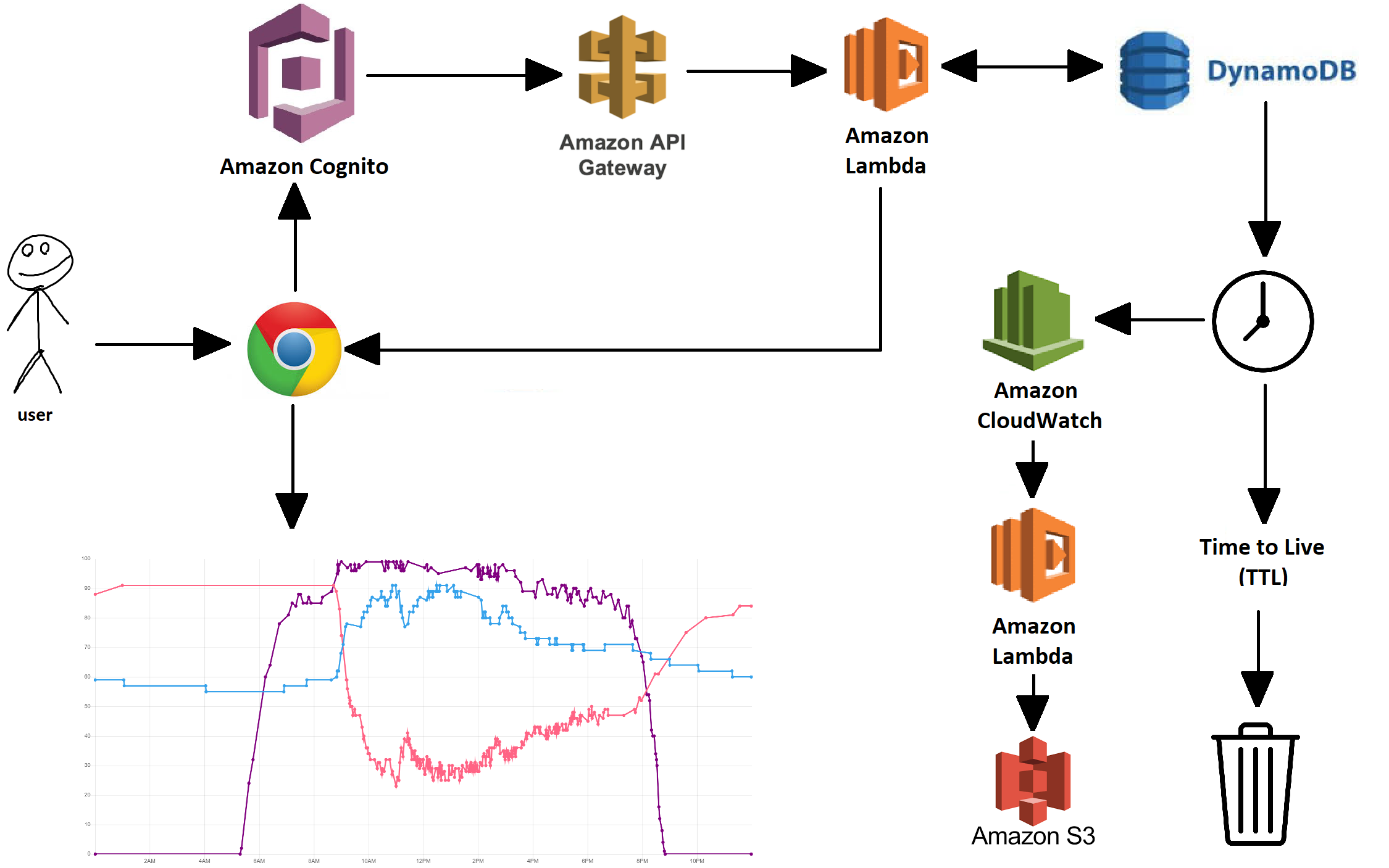 The backend software is serverless within AWS. IoT Core is used to format raw messages as time series data, which are then written to DynamoDB. The DynamoDB table is configured with a "Time to Live" attribute, which automatically deletes data older than one week. Data is archived in S3 before the delete happens. Users authenticate via Cognito, which authorizes them to call a Lambda function through API Gateway. This Lambda retrieves the trailing seven days of data from Dynamo DB.